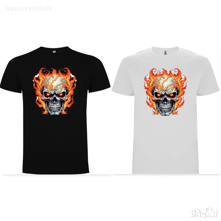 Новa детска тениска в черен или бял цвят Skull On Fire - Горящ Череп, произведена от 100% памук с плътност на тениската 190гр./м². Тениската е с тънко деколте съдържащо ликра за по-добра здравина при