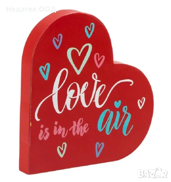 Дървена декоративна табела във формата на сърце с послание "Love is in the Air".