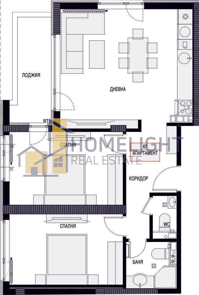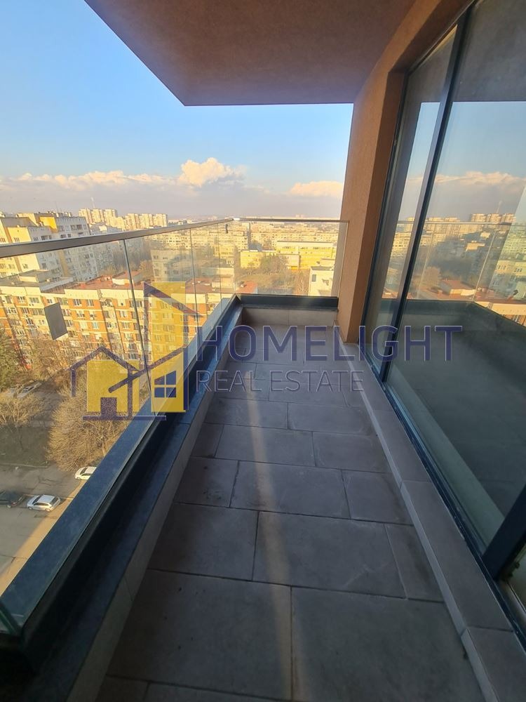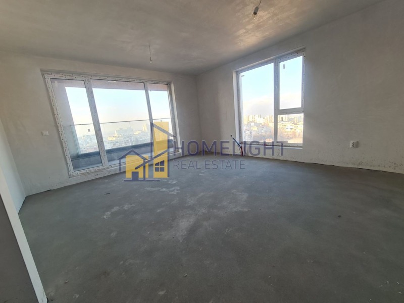 Предлаганият апартамент е позициониран на 12-ти етаж в нова луксозна сграда с предстоящ акт 16 до пролетта на 2025 г. Площта на имота е 104,64 кв.м., включваща мазе 5,44 кв.м. и жилищна площ 99,20 кв.м., като чистата застроена площ е 82,69 кв.м., разпределена във голямо, функционално входно антре, просторна дневна с кухненски бокс и трапезария, две големи спални, баня с тоалетна, отделна тоалетна и тераса.