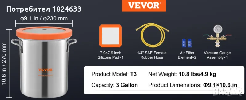 НОВА Вакуумна камера неръждаема стом, 3 галона / 11 л Ф=23см H=27см