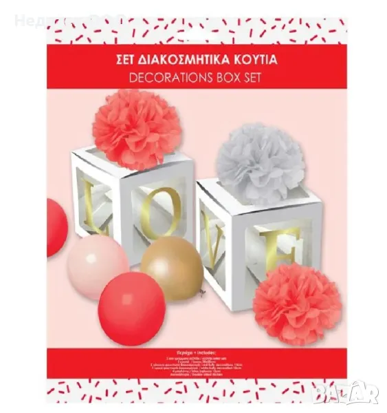 Декоративна златна кутия за балони, която ще оформите и напълните сами. Сглобете картонената кутия и залепете червените букви върху прозрачните страни. Напълнете го с 13 см цветни балони, включени в опаковката и кутията за балони е готова. Създайте цветните пон понс (15 см и 18 см), които ще завършат кода и го поставете където искате. Украсете за вашето парти или събитие и направете фурор!