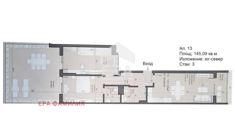 - Разпределение: Антре което води до две спални с голяма обща тераса от 40 кв. м., две бани с WC, просторна дневна с трапезария и кухненски бокс и балкон.