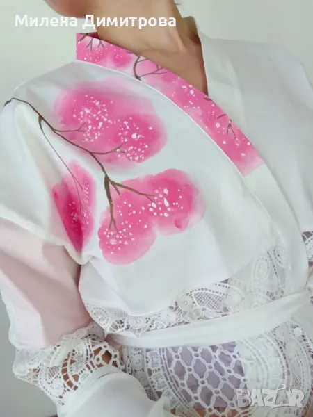 Дамско кимоно от сатениран памук, въздушна дантела, коприна и нежна рисувана Сакура - това кимоно е специално и единствено по рода си.