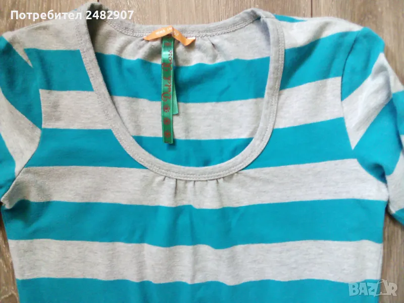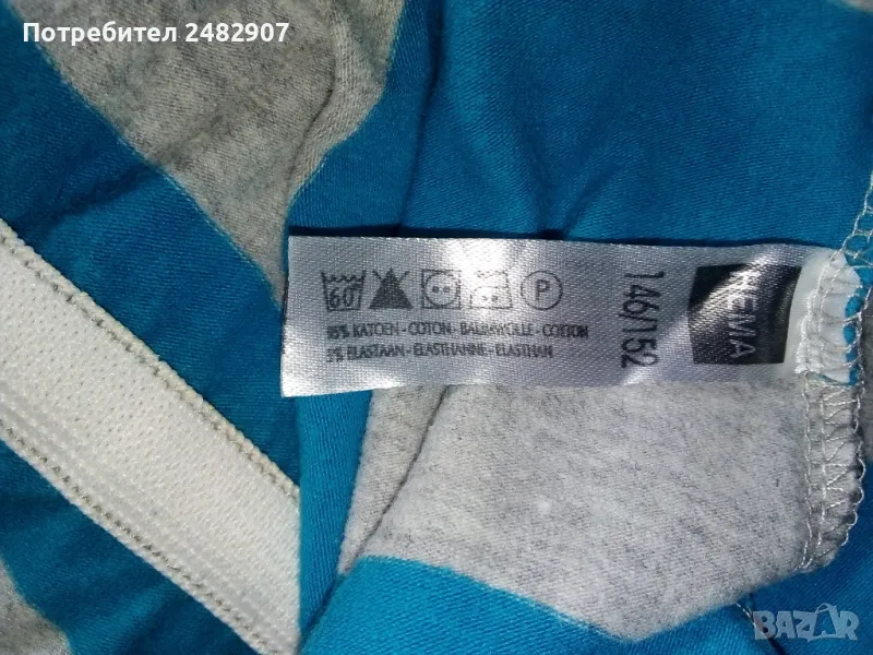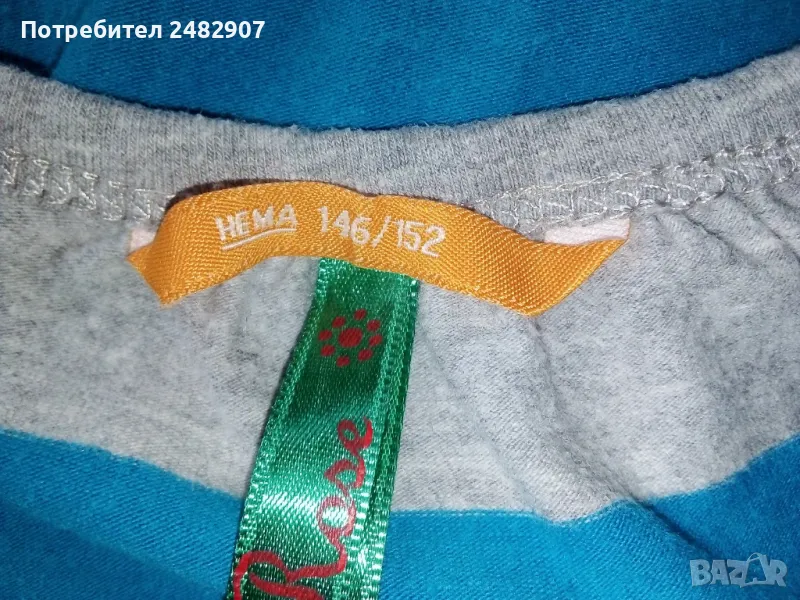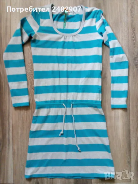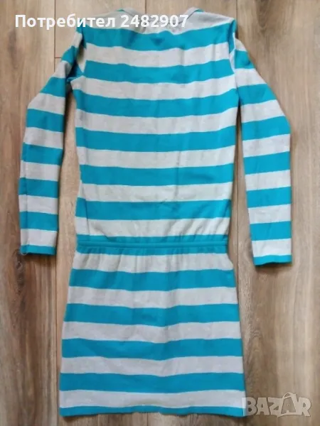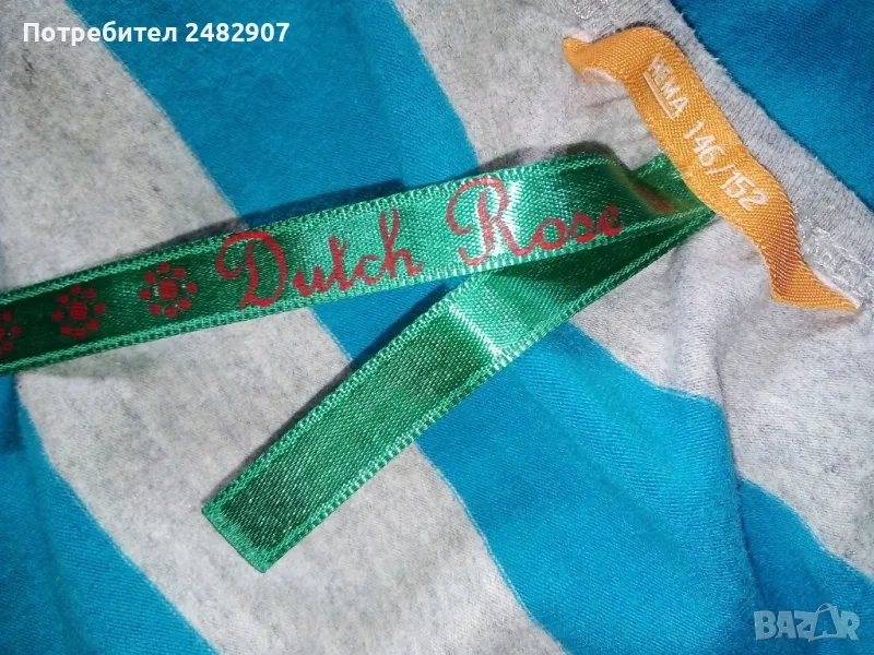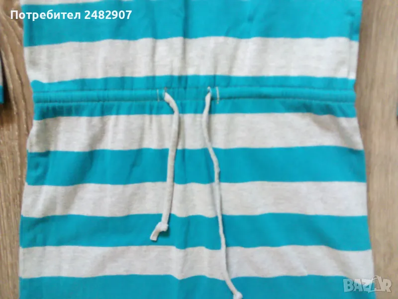 Памучна детска рокля на раета за ръст - 146-152 см. Съдържа 95 % памук и 5 % еластан. Ширина в раменете - 32 см, ширина под мишниците - 38 см, ширина в долната част - 45 см, дължина от рамото до долу - 86 см, дължина на ръкава от рамото - 52,5 см, ширина на ръкава в долната част - 8,5 см. Много запазена, почти не е използвана, с ластик и връзки в талията.