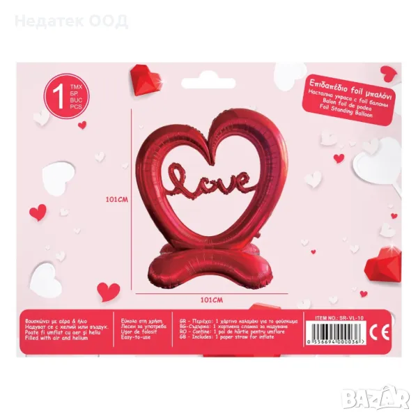 Червен фолиен парти балон във формата на сърце с основа и 3D послание "Love". Лесен за използване, надува се с въздух или слънце. Съдържа 1 12 см сламка. Всичко, от което се нуждае вашето парти за Свети Валентин!