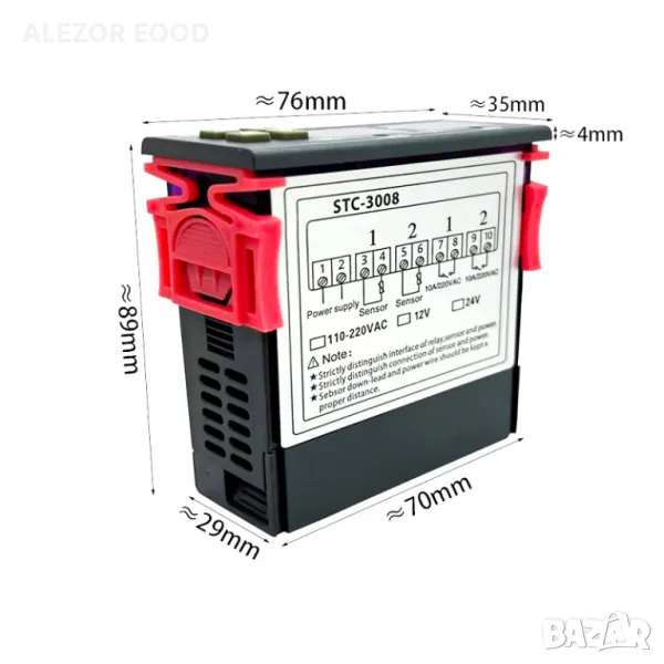 Терморегулатор двоен -55 до +120°C, 220VАC захранване, Два изхода 230VAC/10А NO, Два сензора, Двупосочен термостат STC 3008