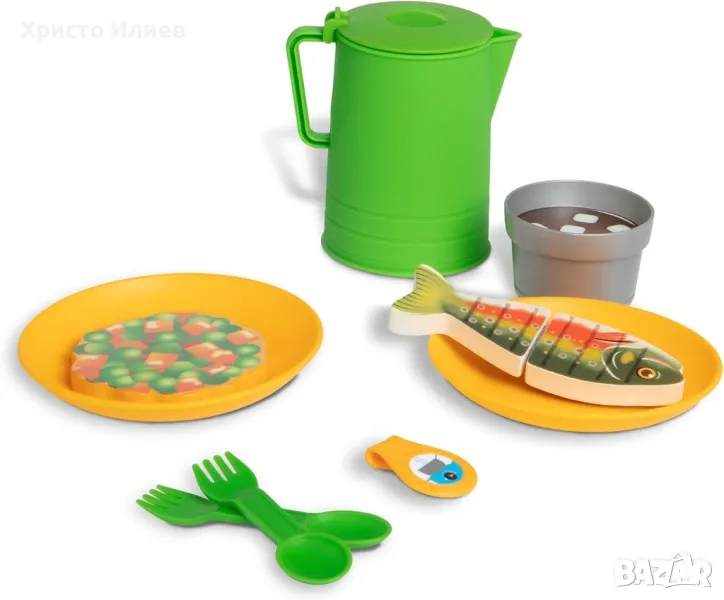 - Включва режеща се дървена риба, двустранна филцова подплата, филцово яйце в пластмасова черупка, издръжлив чайник, 2 чаши с вложки за напитки, 2 чинии, 2 спорка и колекционерски медальон, книга за занимания за многократна употреба