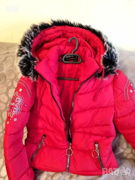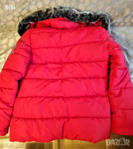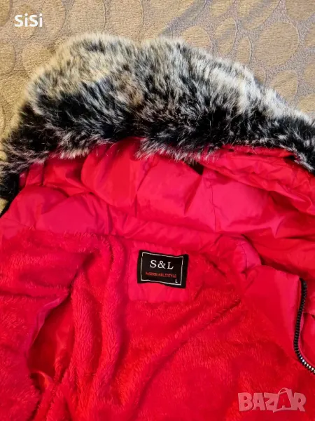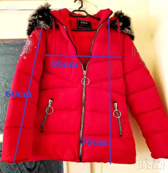 Зимно яке, има 2 ципа отпред, пухкава яка,която може да се маха.Размера е L, сантиметрите са показани в снимка.Няма забележки.