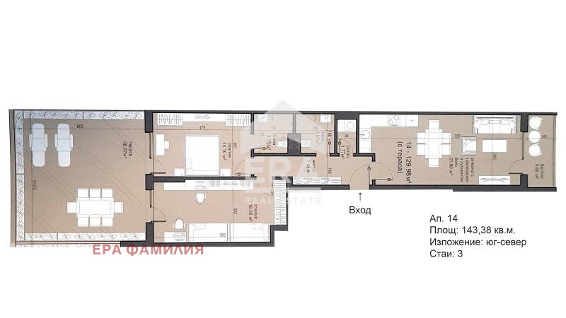 - Разпределение: Антре което води до две спални с голяма обща тераса от 39 кв. м., две бани с WC, просторна дневна с трапезария и кухненски бокс и балкон.