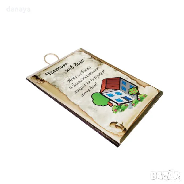 – Надпис: „Честит нов дом! Нека любовта и благоденствието никога не напускат този дом!“