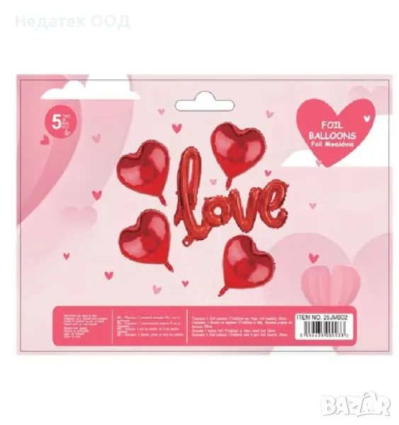 Парти балони във формата на сърце 4 броя с дължина 35см и 1 бр с 3D послание "Любов" 77х60см. Лесни за използване, надуват се с въздух или хелий. Съдържа 1 12 см сламка. Всичко, от което се нуждае вашето парти за Свети Валентин!
