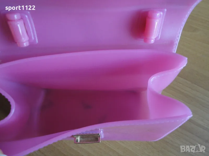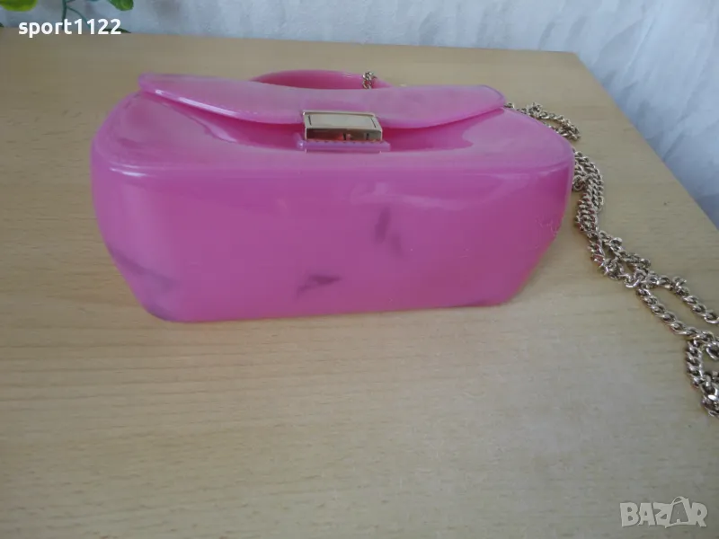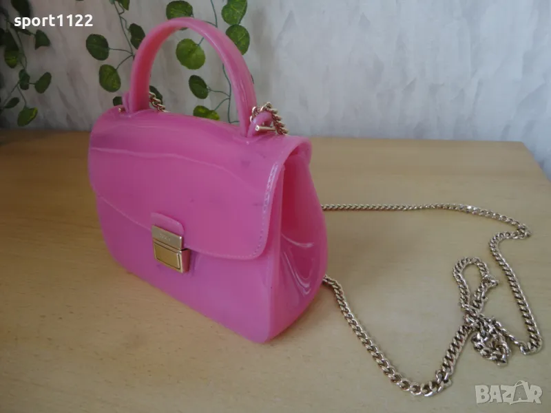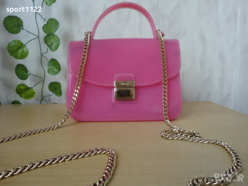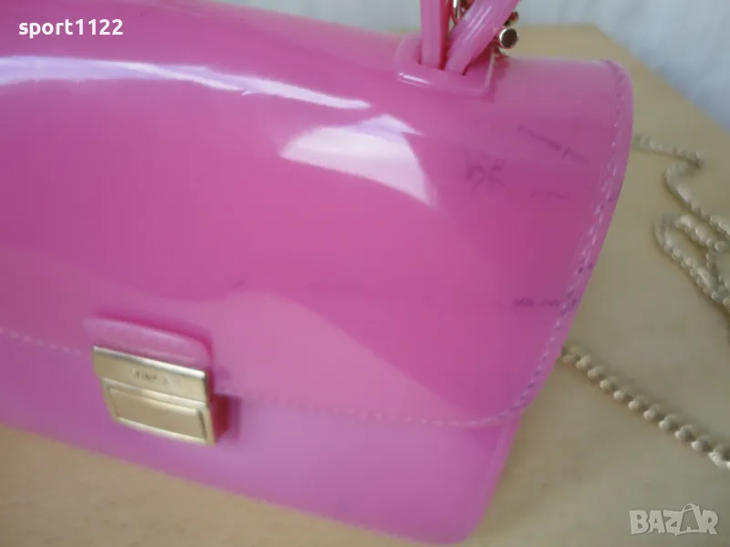 Чантичка Furla, оригинална, розов силикон и златист синджир. Има забележки по материала, отдолу на дъното има петънца от оцветяване, а също по-слаби отпред на капака/снимки 4 и 5/. На пръв поглед не се забелязват. Цената е съобразена с тези забележки.