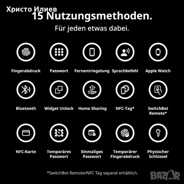 Част от екосистемата на SwitchBot: Използвайте Lock Pro с други SwitchBot устройства за интуитивно и автоматизирано интелигентно домашно изживяване. От завеси до климатици, всичко може да се съчетае. Свързан към SwitchBot Keypad Touch (продава се отделно), можете да използвате до 15 метода за отключване, включително отключване с пръстов отпечатък, еднократни пароли, временни пароли, дистанционно управление, гласови команди, Apple Watch и др.