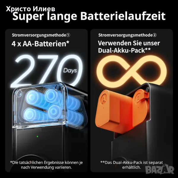 Супер дълъг живот на батерията: С 4 x AA 1,5 V батерии, можете да постигнете живот на батерията до 6-9 месеца (в зависимост от употребата). Моля, сменете батерията веднага щом се появи съобщението за изтощена батерия.