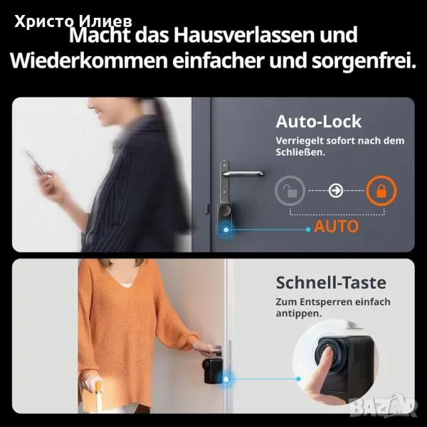 Автоматично заключване и известия в реално време: С автоматично заключване ключалката се заключва автоматично, когато напуснете или влезете в къщата. В допълнение, Lock Pro може да докладва за състоянието на ключалката на вратата и общото състояние на вратата в реално време. (За дистанционно управление е необходимо допълнително закупуване на SwitchBot Hub.)