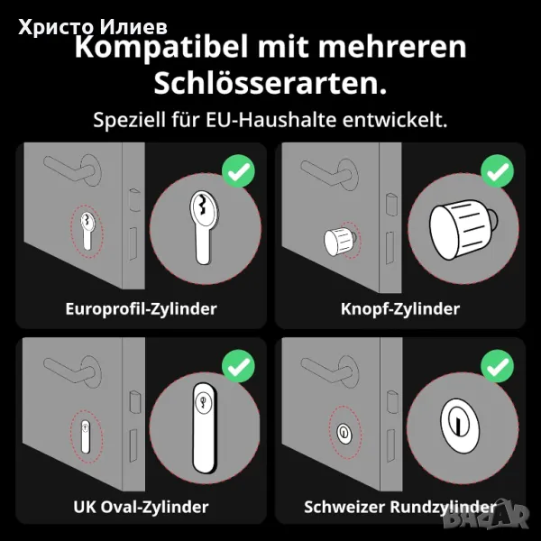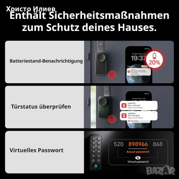 Разширена съвместимост: Алуминиевата сплав на корпуса осигурява по-здрав и издръжлив дизайн. Lock Pro може да се монтира допълнително и по този начин елиминира необходимостта от пробиване на отвори. Монтажът е бърз и лесен и не поврежда съществуващата брава. Перфектен за апартаменти и къщи!