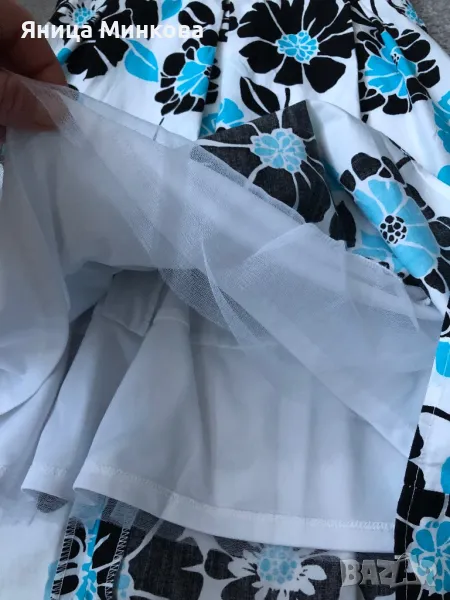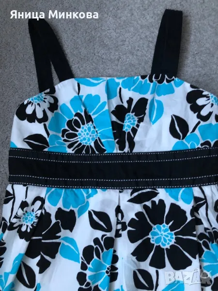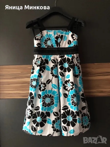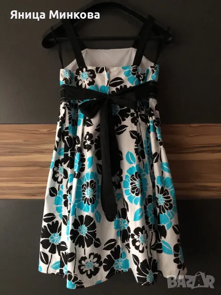 В отлично състояние, обличана 1 път за повод. Няма следи от употреба. Дължина с презрамките- 83 см, от подмишница до подмишница- 41 см едностранно. Изпращам с преглед и тест.