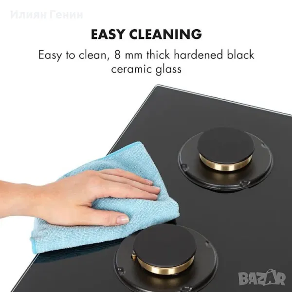 След приключване на готвенето, газовият котлон може лесно да се почисти, ако е необходимо, затова повърхността е направена от лесно измиващо се, втвърдено черно керамично стъкло с дебелина 8 мм. Не само че изглежда невероятно елегантно, но и удивително лесно се почиства.
