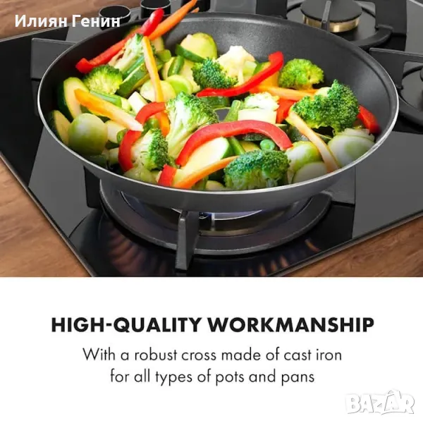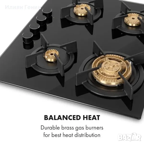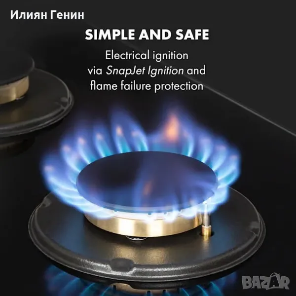 Готварският плот Klarstein Goldflame Domino заема малко място и разполага с четири висококачествени горелки, които загряват с мощност от 3,4 kW, 2 x 1,8 kW и 1,0 kW. Както подсказва наименованието на серията Goldflame, избрахме висококачествени месингови горелки, които не само изглеждат елегантно, но и предлагат значително по-дълъг период на експлоатация в сравнение с обикновените алуминиеви горелки като в същото време гарантират по-добро разпределение на топлината върху плота. Разлика, която виждате и чувствате. И двете горелки разпределят топлината равномерно по средата и краищата на тенджерите и тиганите, всичко е перфектно и оптимално приготвено. Твърдата чугунена решетка е подходяща за почти всички видове кухненски прибори, поставя се прецизно и без риск от преобръщане на съдовете. Управлението е абсолютно интуитивно благодарение на лесно разбираемите символи на големите въртящи се копчета, а подаването на топлина винаги може да се регулира по време на процеса на готвене. Именно това е най- голямото предимство на газовите печки: промените на силата на пламъка имат незабавен ефект върху промените в температурата на съда или тигана. Разбира се, обърнахме внимание и на безопасността на печката: не е необходим допълнителен огън, за да се запали. Газовият пламък се запалва лесно с помощта на системата за запалване SnapJetIgnition. Защитата при повреда на пламъка блокира подаването на газ към горелката, ако пламъкът изгасне по някаква причина.