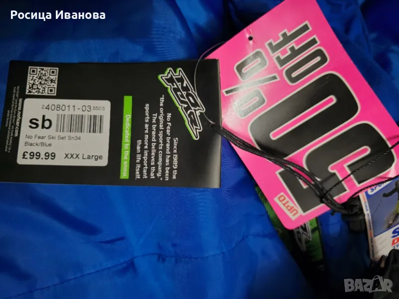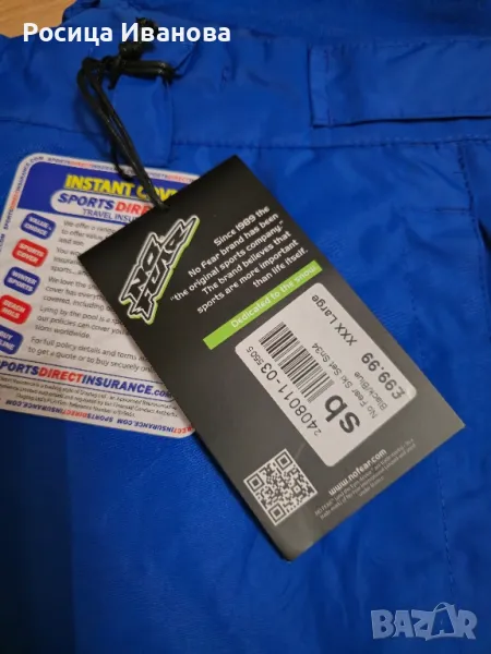 No Fear мъжки ски екип, размер 2XL, макар че по етикет е 3 XL. Якето е черно с турско синя подплата, а панталона е турско син. Нов, никога не е обличан.