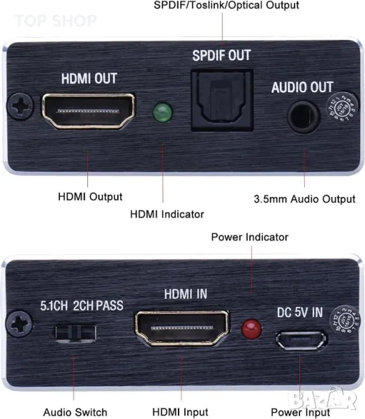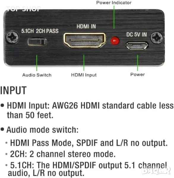 Съвместим с 1.4 HDMI, 4K Ultra HD, 1080P/60Hz, 3D/24Hz; SPDIF и L/R аудио поддържат изход отделно към усилвател без свързване на HD телевизор/монитор