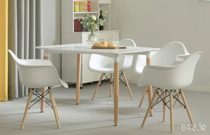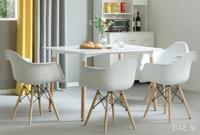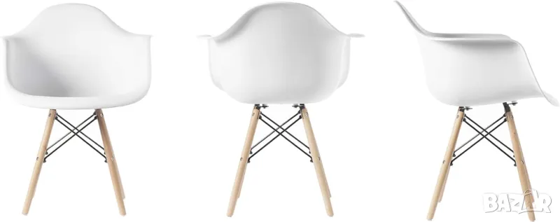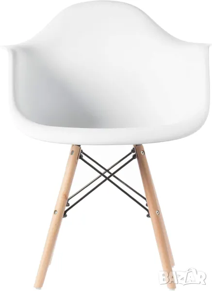 Модерен пластмасов трапезарен стол DAW от средата на века с дървени дюбели Айфелови крака, комплект от 4 бели