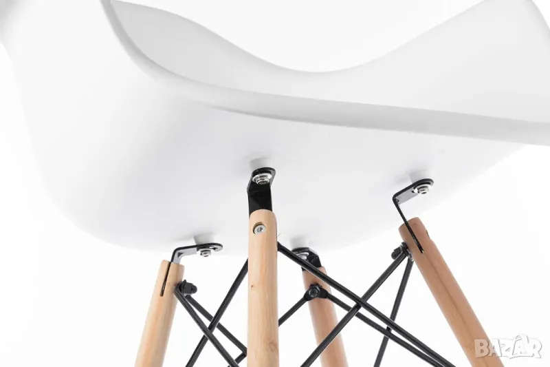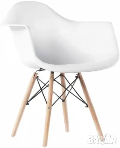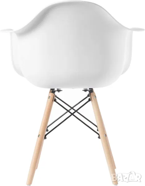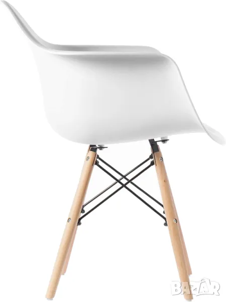 СЪСТАВ: Седалката, ръцете и облегалката на стола са формовани от твърда полипропиленова (PP) пластмаса, здрав рециклируем материал. Краката в стил Eiffel са изработени от масивна букова дървесина в естествен дървесен цвят, демонстриращ красивата си дървена структура.