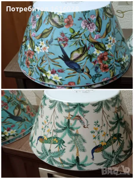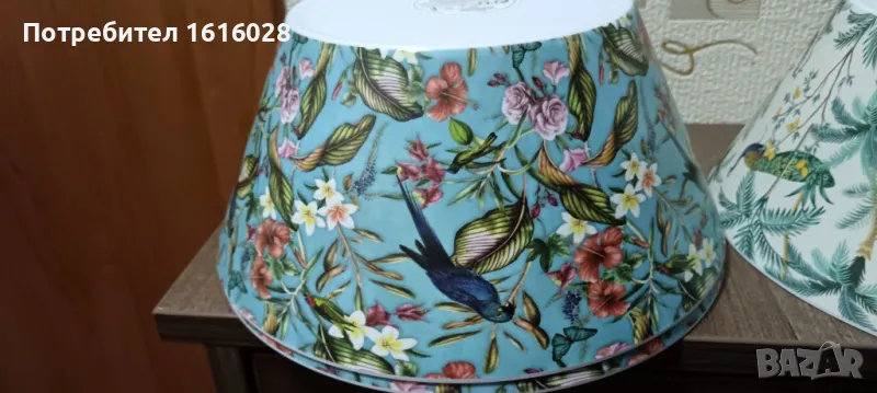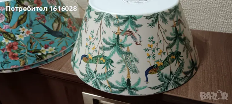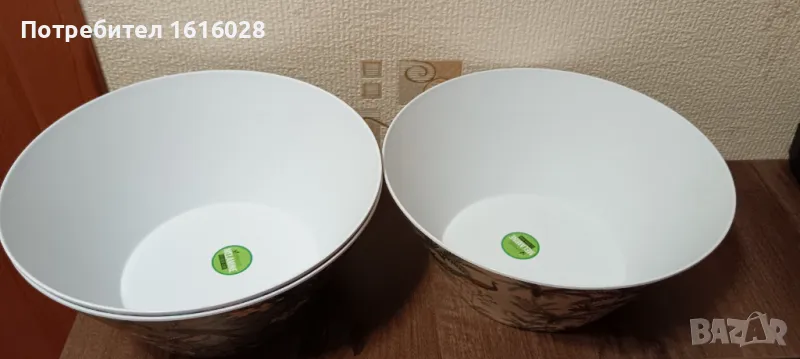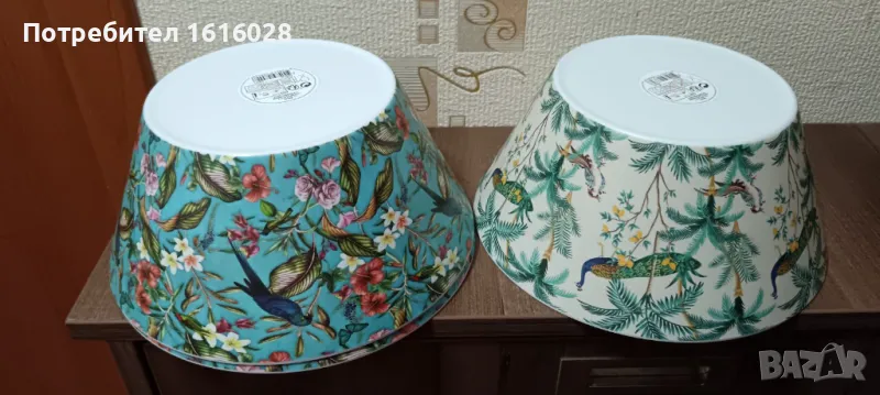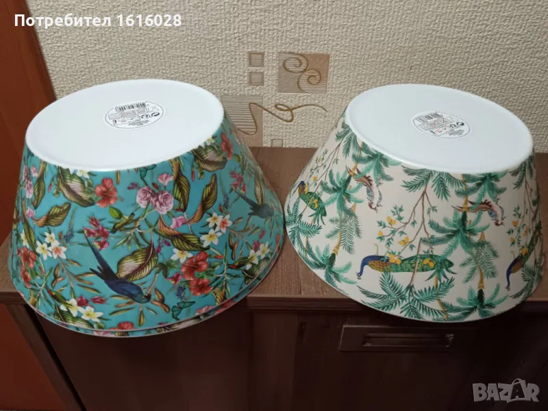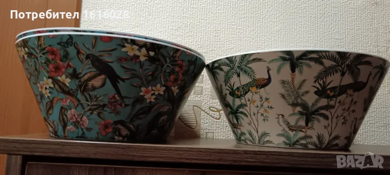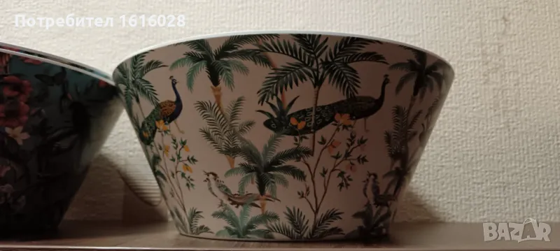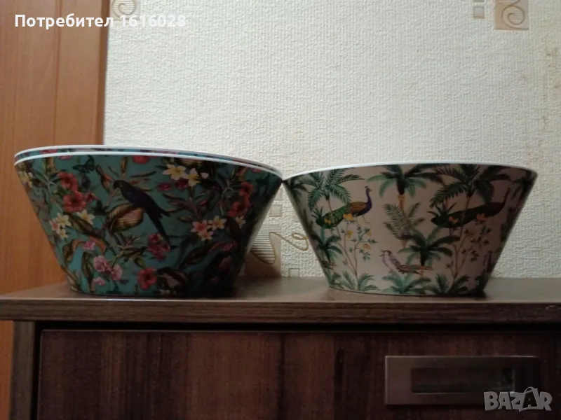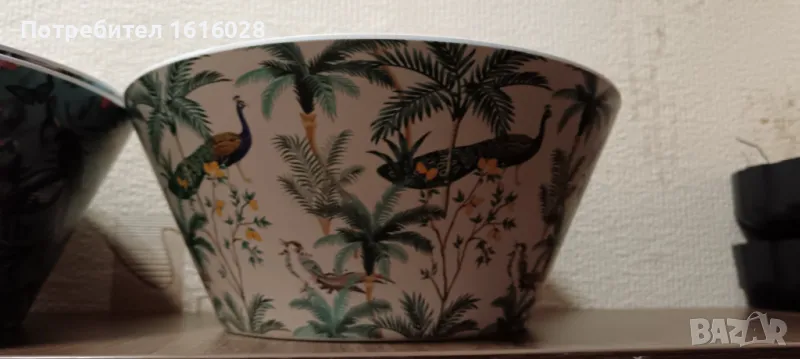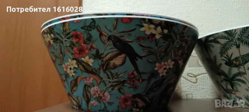 Многофукционална купа за хранене и сервиране, изработена от меламин с многоцветна щампа на цветя и птици.