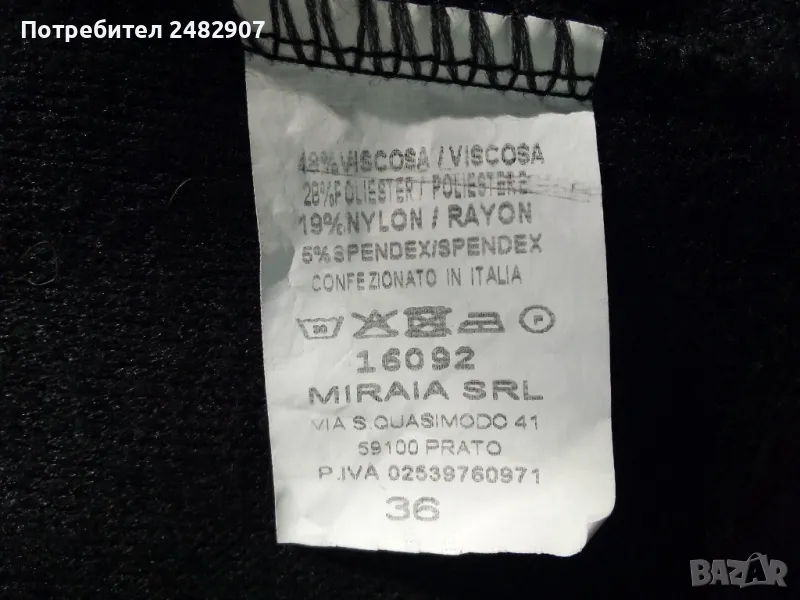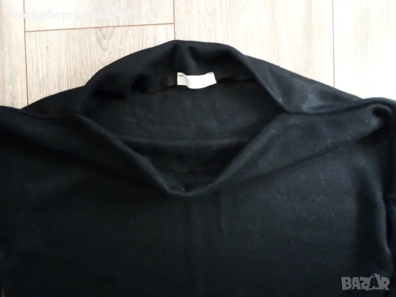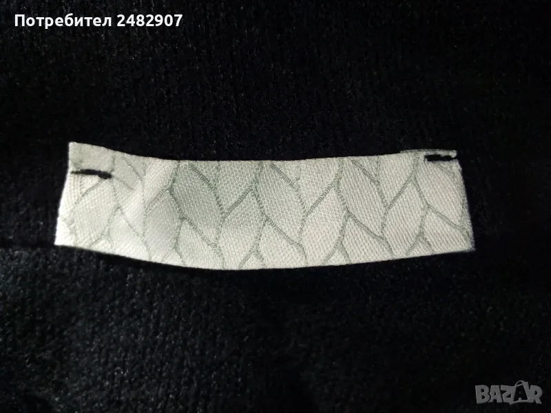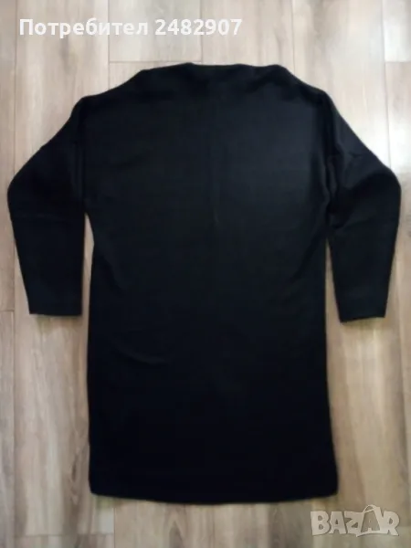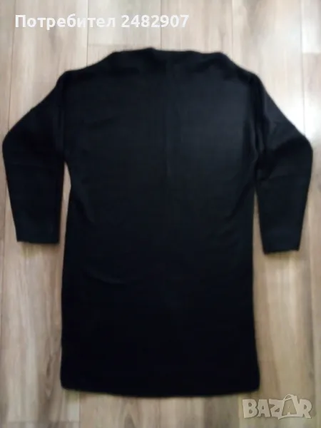 Машинно плетена черна дамска туника с паднал ръкав, размер L. Съдържа 48 % вискоза, 28 % полиестер, 19 % найлон и 5 % спандекс. Ширина в раменете - 77 см, ширина под мишниците - 54 см, ширина в долната част - 52 см, дължина от рамото до долу - 86 см, дължина на ръкава от рамото - 36 см, ширина на ръкава в долната част - 11 см. Чисто нова, не е използвана, много мека и приятна на допир.