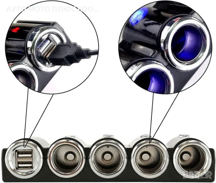 Разклонител за запалка на кола 12 / 24V с 4 гнезда и 2 USB порта.