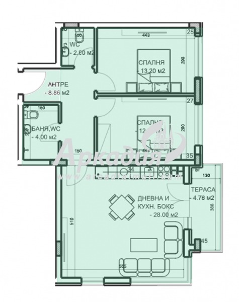 Апартаментът е със следното разпределение: голям хол с трапезария и кухненски бокс, две спални, баня с тоалетна,тоалетна,склад, входно антре и тераса.