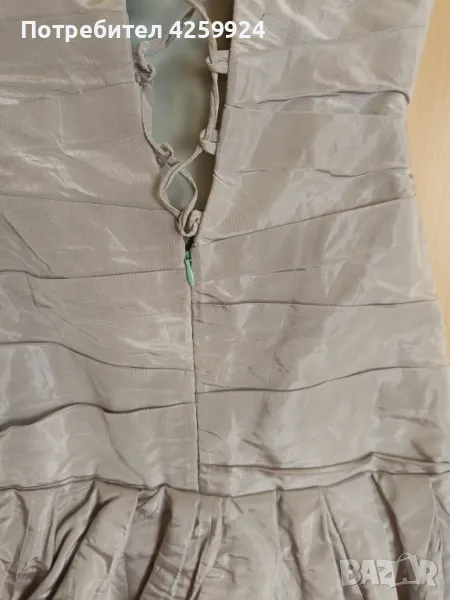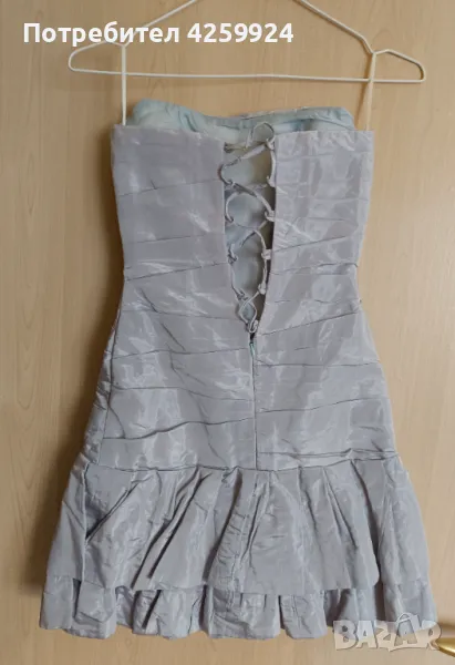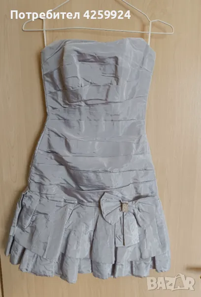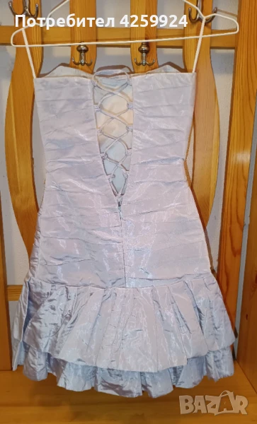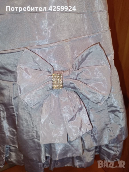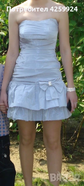 Бална рокля от ателие Версай - Асеновград с дизайнер Вера Василева. Подходяща за сватба, бал или друг официален повод. Роклята е с панделка с брошка отпред (може да се смени с друга брошка) и корсет в задната част (под връзките продължава с цип и копче). Дължината е малко над коляното. Роклята е сиво/син цвят и е изработена от телена тафта, като отдолу има подплата. Размера е XS/S. Към роклята има и чанта тип бонбон.