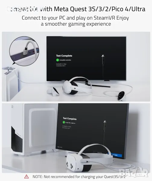 - Съвместим с аксесоари Meta Quest 3S/Quest3/Quest2/Pro/Pico 4: Този кабел поддържа USB 3.0 скорост на предаване. Стабилната и бърза синхронизация на данни, работеща с постоянен и надежден ток, ви осигурява гладко VR игрово изживяване. Прикрепената велкро лента фиксира кабела и слушалките, за да предотврати прекъсване на връзката по време на движение. Забележка: Когато се свързвате към вашия компютър, моля, поставете този USB 3.0 кабел в USB A 3.1/USB A 3.0 порта.
