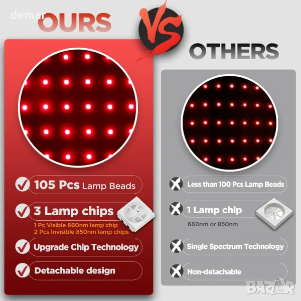 Отличаващ се с двойноспектърно представяне със 105 LED светодиода, този колан с червена светлина комбинира 660nm и 850nm дължини на вълната за оптимален комфорт. Той предлага пет регулируеми нива на яркост и масаж, предоставяйки персонализирано изживяване с равномерни вибрации. Вграденият таймер осигурява шест настройки от 5 до 30 минути, осигурявайки безопасност с автоматично изключване. Проектиран за удобство, той поддържа две опции за захранване - адаптер или USB кабел за преносимост. Регулируемите презрамки побират различни части на тялото, което го прави универсален за използване у дома или в офиса. Пакетът включва колан с червена светлина, удължителен колан, захранващ кабел, контролер и USB кабел. Забележка: Не може да се пере в пералня; отстранете LED светлинната пластина преди ръчно пране.