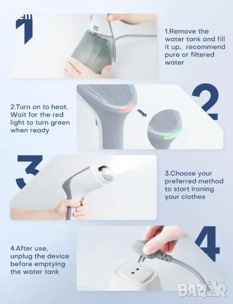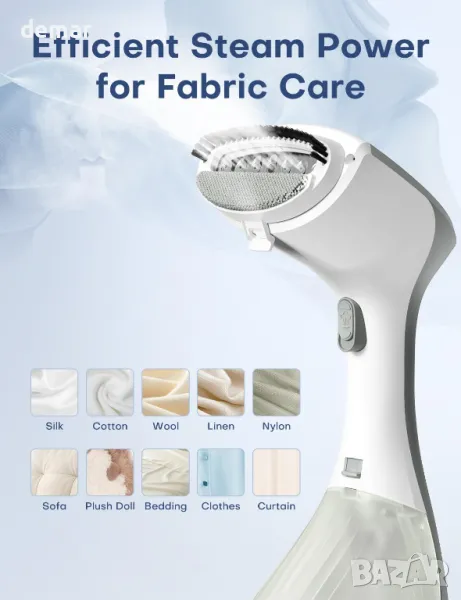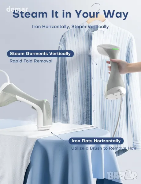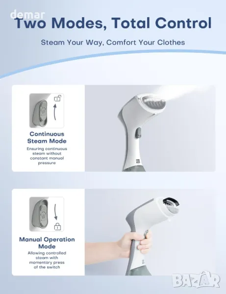 Високомощна 1300 W машина за пара за дрехи с парен панел 8,7*4 cm осигурява бързо и ефективно премахване на гънки за различни тъкани. Подвижен прозрачен резервоар за вода от 260 ml осигурява до 15±5 минути непрекъснато гладене, с лесно презареждане и следене на нивото на водата. Разполага с два режима на пара - непрекъснат за постоянна мощност и ръчен за контролирани изблици. Дизайнът 2 в 1 позволява както хоризонтално гладене, така и вертикално изпаряване, което го прави универсален за различни дрехи. Ергономичният, компактен и изправен дизайн осигурява удобна употреба у дома или по време на пътуване. Подходящ за множество повърхности, включително плюшени играчки, завеси и постелки, с включена четка за премахване на косми и мъх. За най-добри резултати използвайте пречистена или дестилирана вода, за да предотвратите образуването на котлен камък, загрейте предварително за 25 секунди и изчакайте зелена светлина преди употреба, за да минимизирате течовете.