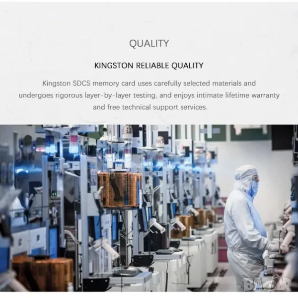 • Kingston Canvas Select Plus microSD карти осигуряват издръжливостта, необходима за улавяне и съхраняване на ценни данни в различни компоненти. Тези карти с памет са строго тествани и са проектирани да бъдат водоустойчиви, устойчиви на удари, удари и рентгенови лъчи.