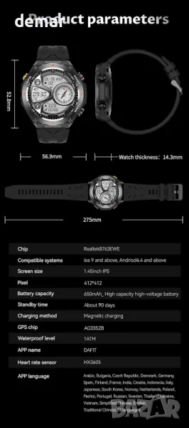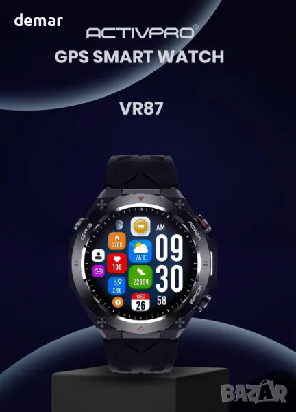 Смарт часовник с множество каишки (черна и тъмносиня) и протектор за екрана, подходящ за ежедневна употреба, туризъм, колоездене и проследяване на фитнес. Вграденият GPS позволява независимо проследяване на маршрути, скорост, разстояние, пулс, калории и време за упражнения в реално време, но не поддържа навигация. Мониторингът на здравето включва сърдечен ритъм, кръвно налягане и проследяване на кислорода в кръвта с повишена точност. Bluetooth обаждането позволява отговаряне и провеждане на повиквания директно от часовника. Разполага с над 100 спортни режима и вграден компас, но не се препоръчва за плуване.