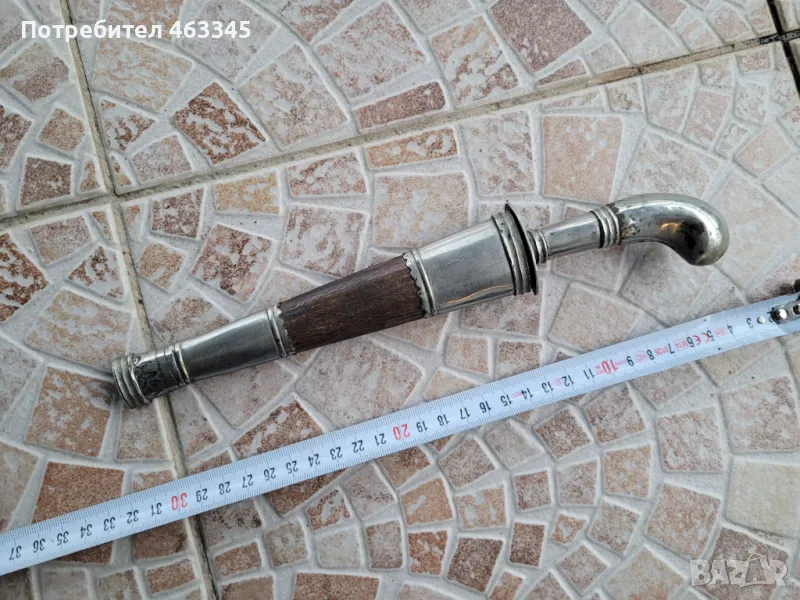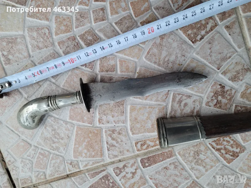 Рядък тибетски нож с леко вълнообразно острие. Ножът е от 19-ти век. Целият нож и канията са обковани със сребро ниска проба. Наустието и върхът на канията са много красиво украсени с гравюри и трипластови апликации. Дървеният на канията е в отлично състояние, без дървояд, отчупено или наранявания. Острието е непочиствано, но е без ръжда и никога не е имало