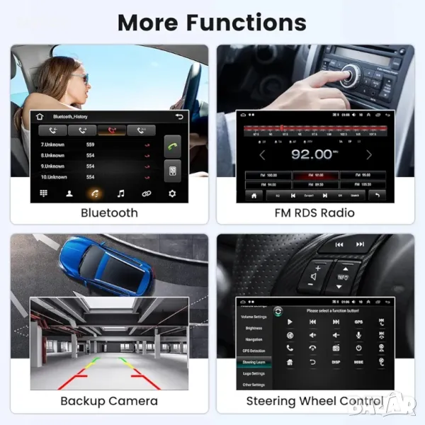 Камера за обратно виждане и връзка с огледалото: Радио с Android с навигация идва с камера за обратно виждане за безопасно паркиране. Поддържа телефонна връзка за повечето телефони (за серия Android 10 и iPhone 8 и по-стари). С функция за управление от волана на автомобила