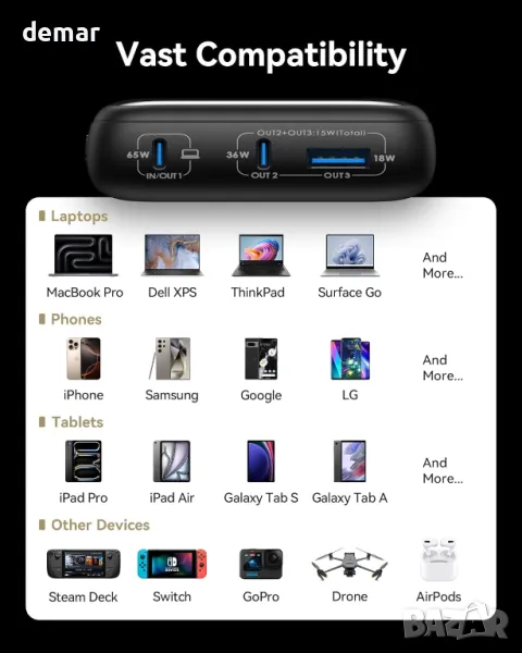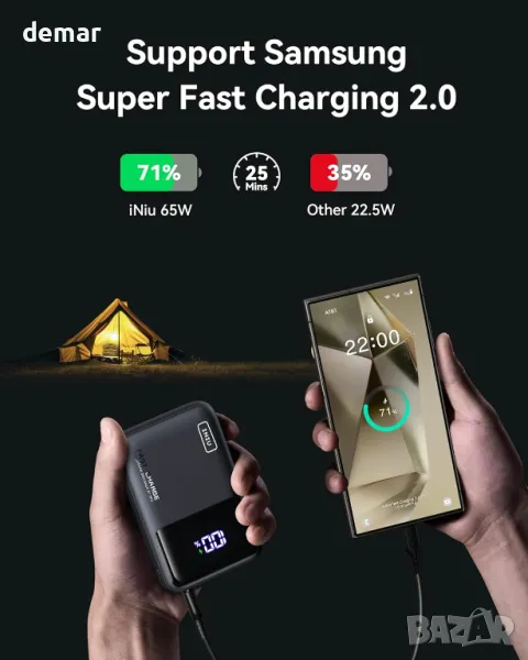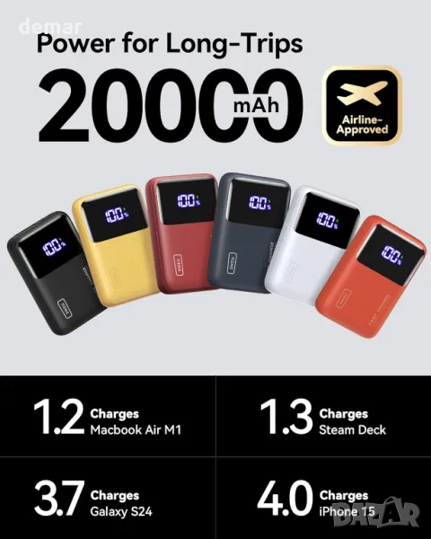Изключително компактна, но мощна, тази 65W 20 000mAh захранваща банка разполага с усъвършенствана технология TinyCell и HyperStack за зареждане с голям капацитет в малка форма. Той бързо зарежда устройства, захранвайки MacBook Air 13” до 41% и iPhone от 15 до 56% само за 25 минути, с поддръжка на Samsung Super Fast Charging 2.1. Проектиран за гъвкавост, той работи безпроблемно с телефони, таблети и дори устройства със слаб ток като AirPods, смарт часовници и фитнес тракери. Включва 100 W USB-C към USB-C кабел за удобство.