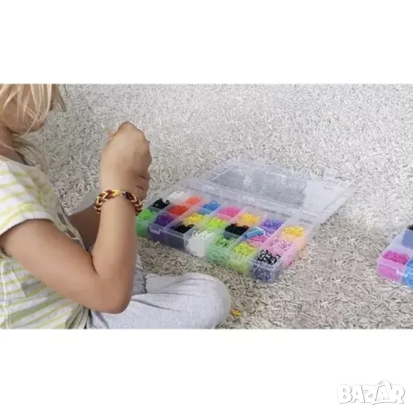 КУТИЯ ЗА СЪХРАНЕНИЕ С ОТДЕЛЕНИЯ – целият комплект е опакован в кутия с 29 отделения. Прозрачната кутия ви позволява да видите къде се намира даден цвят. Освен това отделенията предотвратяват смесването на гумените ленти.