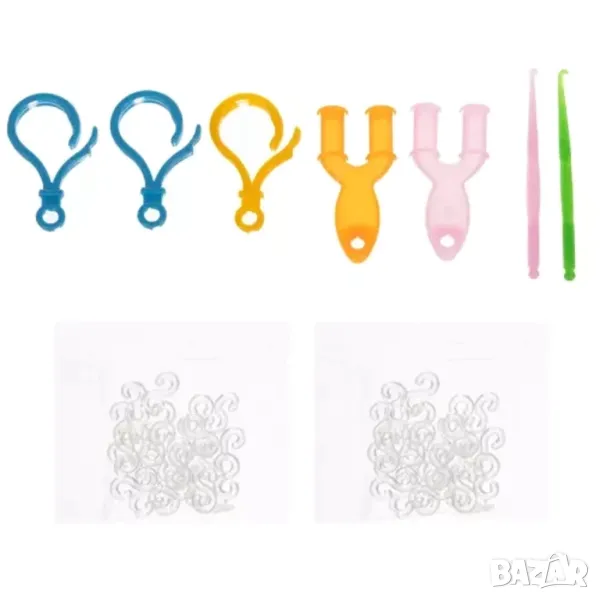 ГОЛЯМ КОМПЛЕКТ – комплектът съдържа всички елементи, необходими за създаване на гривни или други джаджи от ластици. Пакетът съдържа ластици, куки за плетене на една кука, станове, декоративни елементи и висулки.