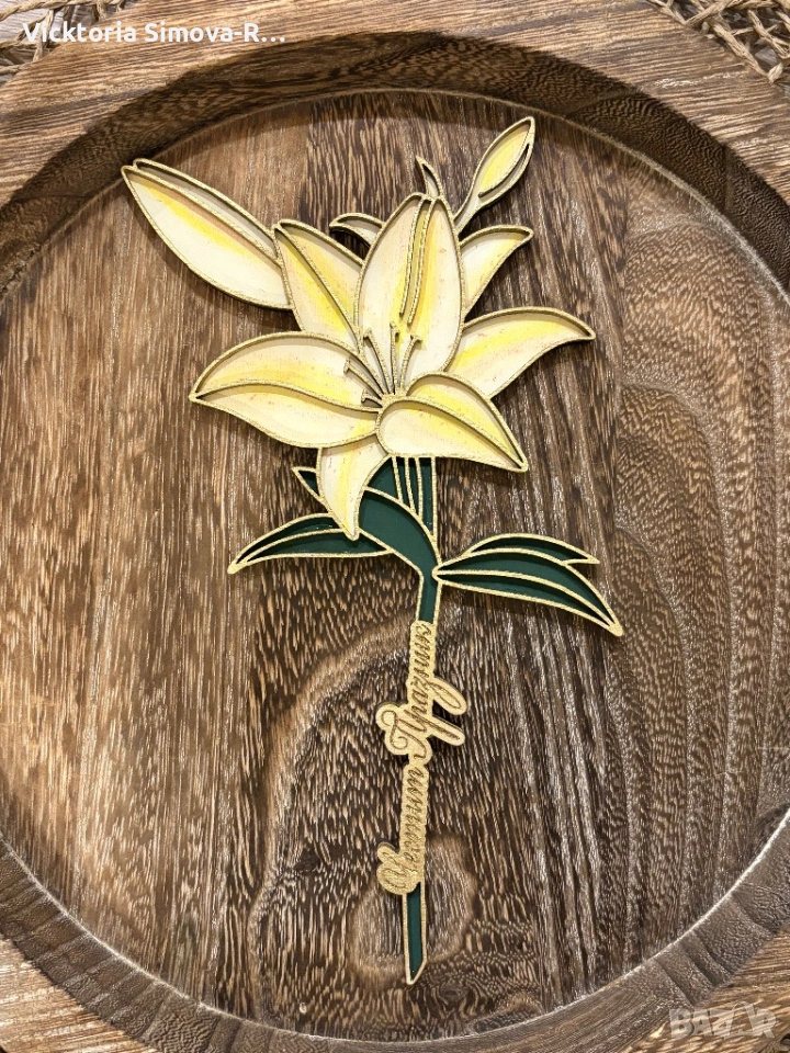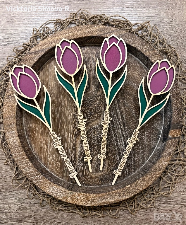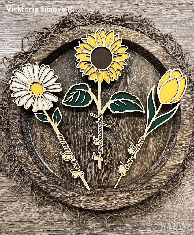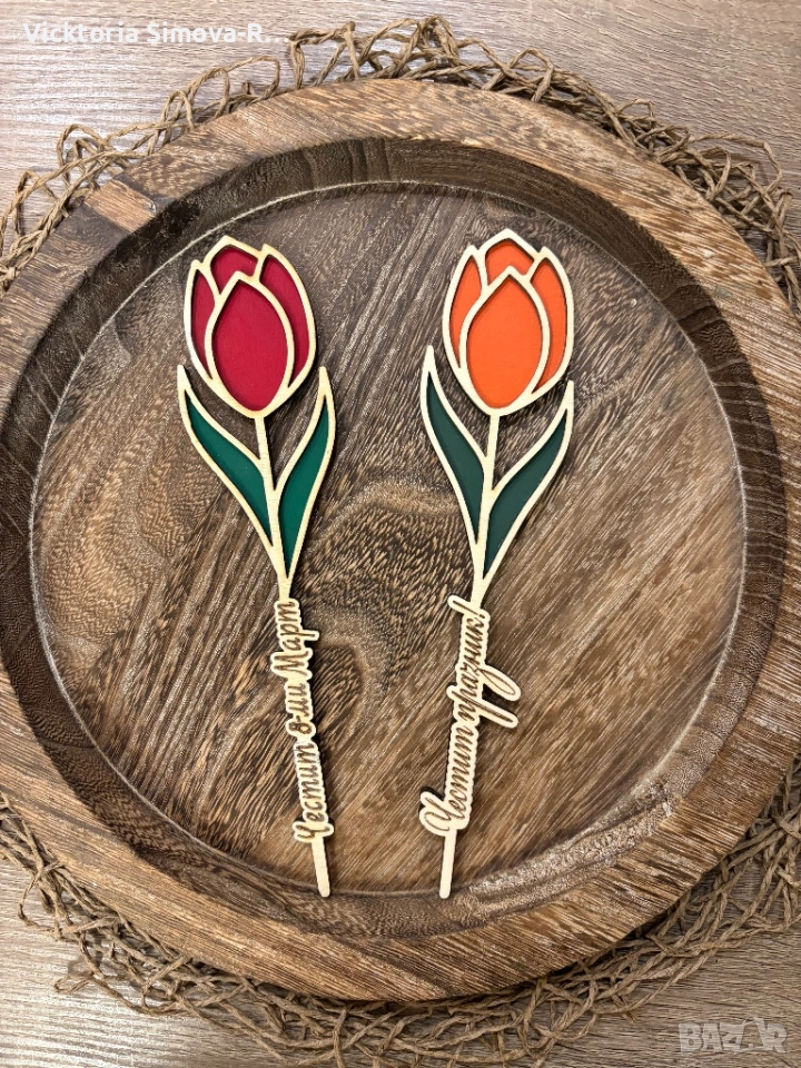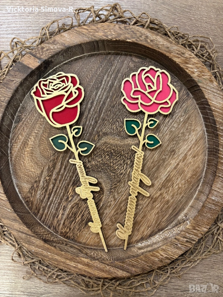 Персонализирани, дървени цветя с надпис, и в цвят по ваш избор. Подходящи, както за подарък за осми март, така и за първия учебен ден, рожден ден, завършване, имен ден и тн., Височината на цветята е 21см. Време за изработка около 2-3 дни или в зависимост от моментната заетост с поръчките и броя и видът на артикулите, които бихте желали да поръчате.