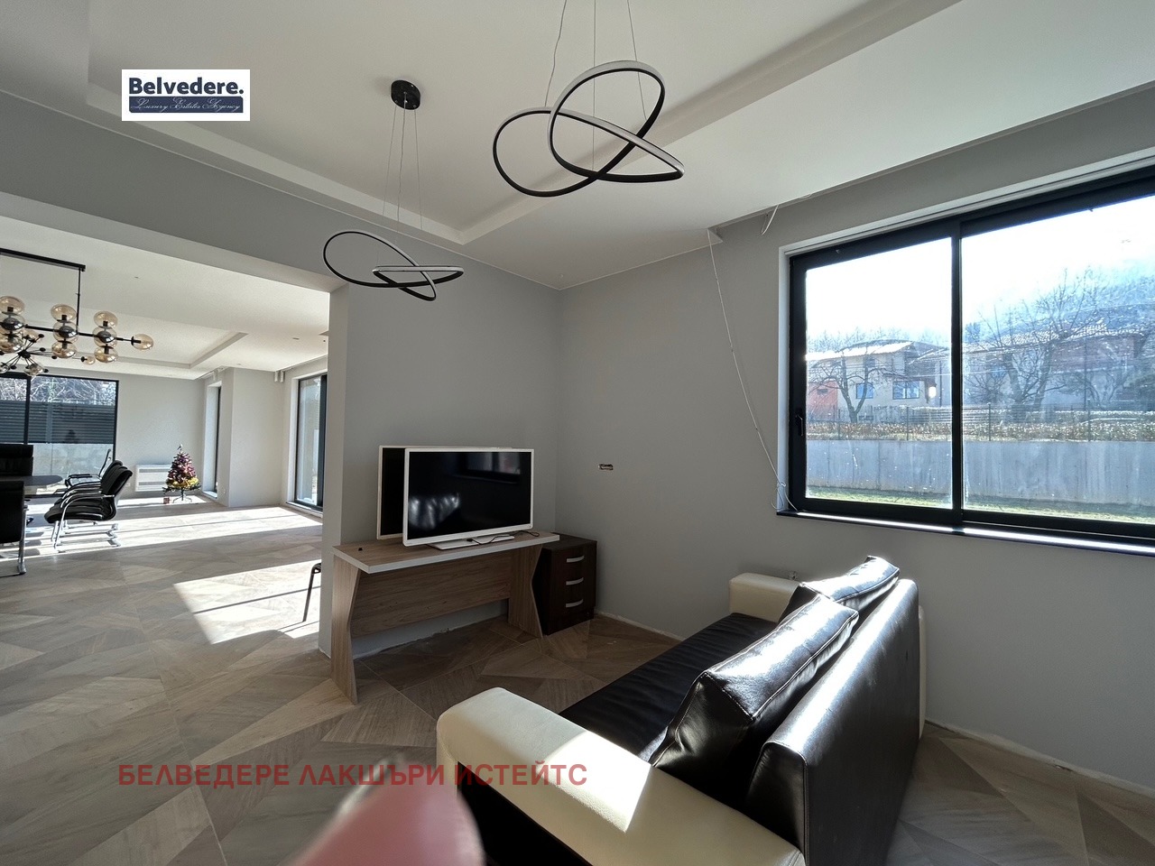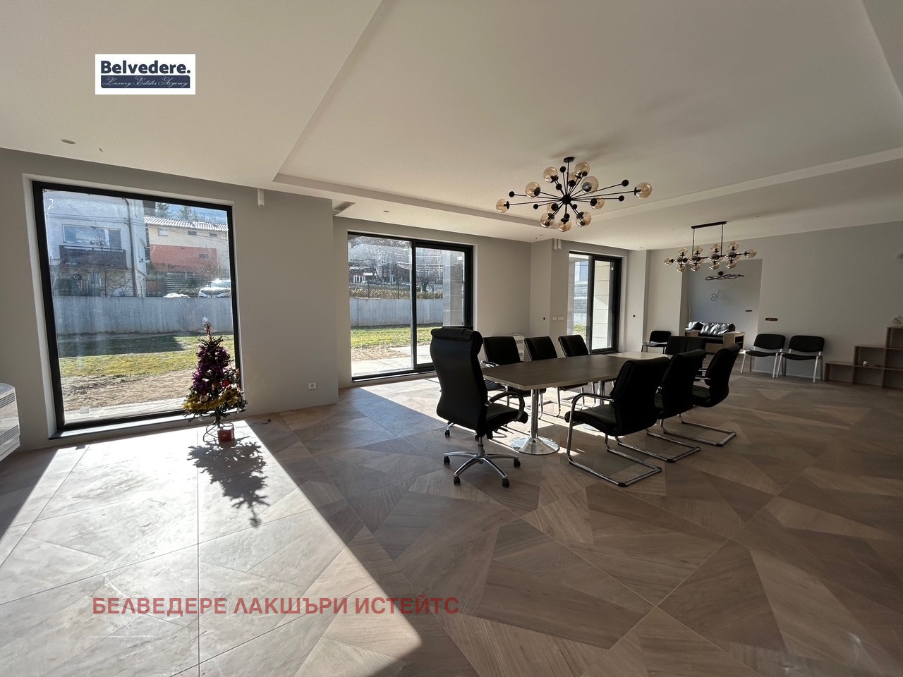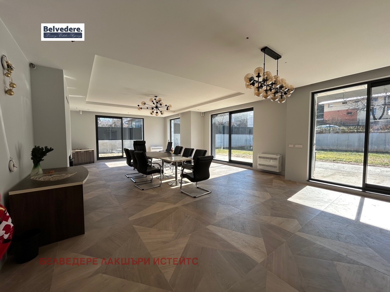 Първи етаж - голямо входно антре,просторна дневна, трапезария и кухня, излаз към двора.На етажа има още офис, гараж за три автомобила.