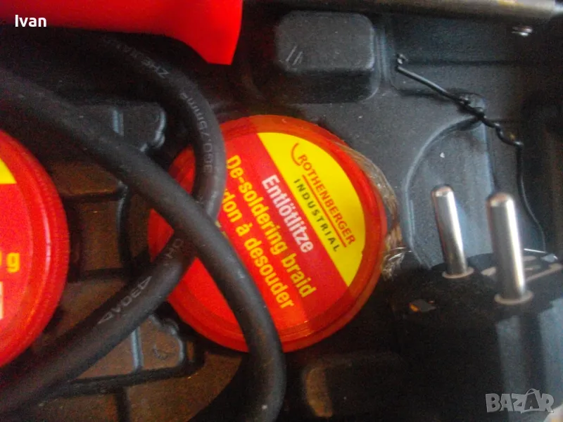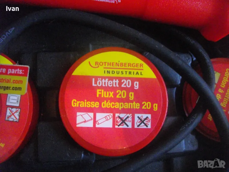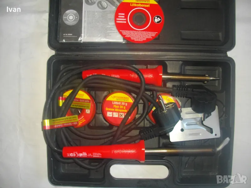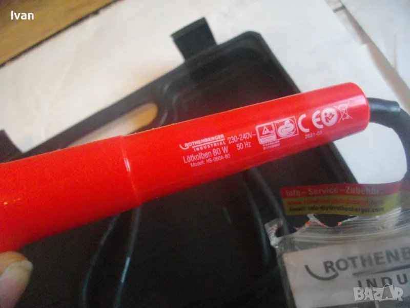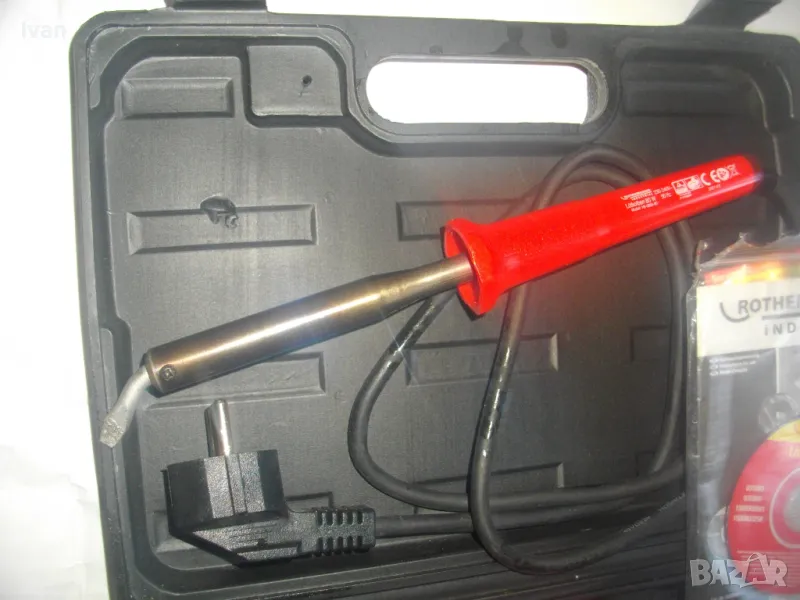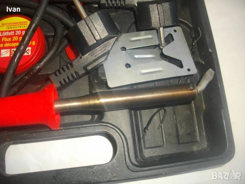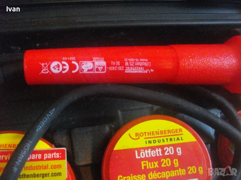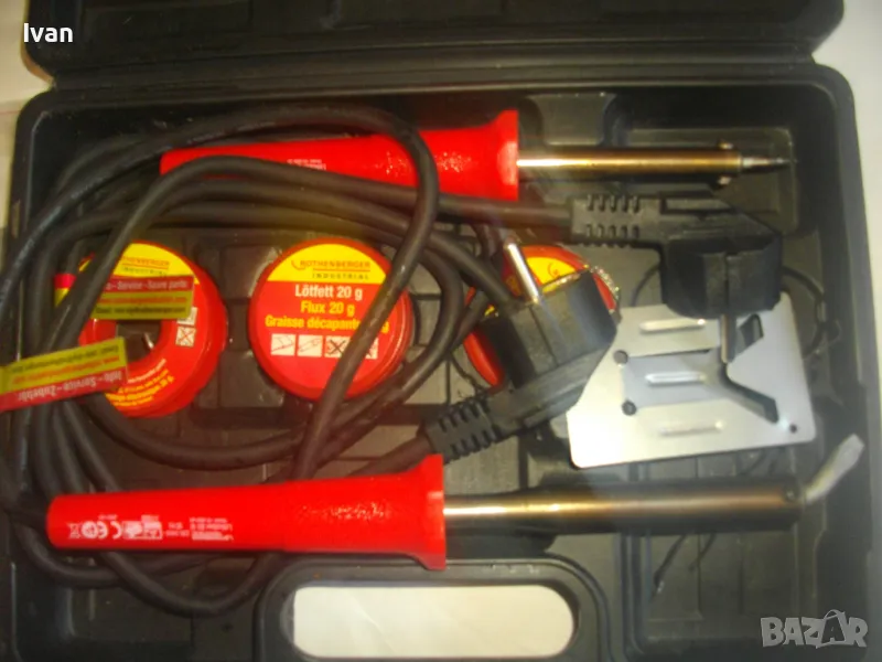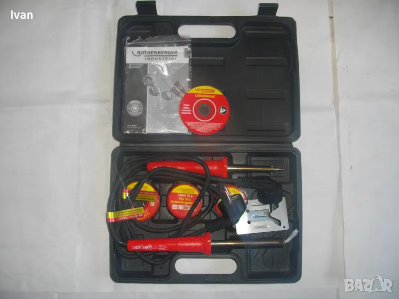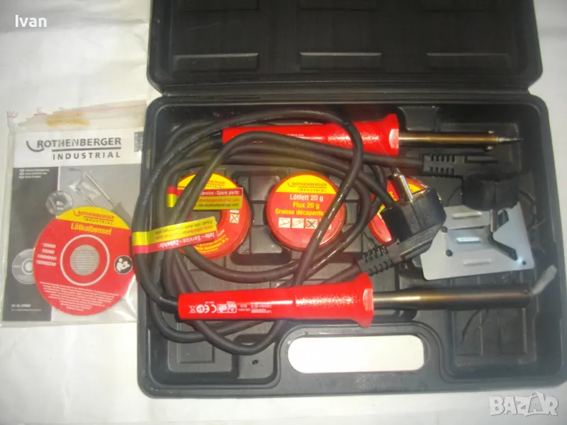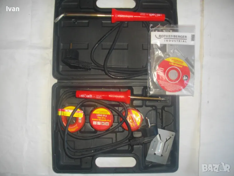 ОПИСАНИЕ на комплект 2 бр. ел. поялници Ротенбергер. цена 299 лв.Марка и модел - Rothenberger Industrial Производство 2021 г. оригинално немско - Deutschland. Комплеткът е професионален/промишлен/индустриален. И двата поялника са почти нови, ползвани 1-2 пъти. В отлично работно тъхническо състояние. И двата са маркирани с марката. Единият е с крива човка с мощност 80 вата и дължина 255 мм, човка дълж. 30 мм и ширина 5 мм. Другия поляник е с остър връх и мощност 25 вата, с дължина 210 мм. В комплекта е включена стойката метална за самостоятелен стоеж, 1 бр. ролка тенол на макара 35 гр х 1,5 мм, 1 р. за запойка многожична 1,5 м х 2,5 мм, 1 бр. кутия с колофон 20 гр. Налична оригиналната немска книжка с оригиналния диск DVD за видео преглеждане с инструкции за правилна употреба на комплекта поялници. Температура, развиваща се от поялниците - 185 - 235 градуса Целзии. Куфар - твърда пластмаса с вградена дръжка и лого на марката. Размери на куфара - 285 х 200 х 55 мм. Тегло на комплекта - 1,5 кг. Цената е твърда и без коментар - 299 лв.
