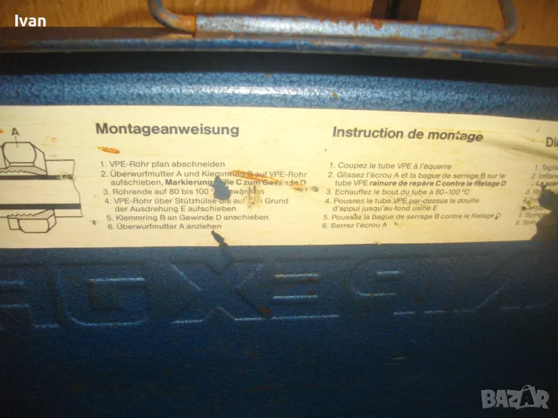 ОПИСАНИЕ на ел. поялник лепачка за ППР тръби ф18мм-ф35мм старо немско качство профи - 299 лв. Висок клас професионален ел.поялник-лепачка за тръби, немски оригинален модел от старото качество на SANIPEX JRG, в вградени 3 бр. различни размери вложки за спояваните ППР тръби . Марка и мдел на машината/инструмент: SANIPEX JRG