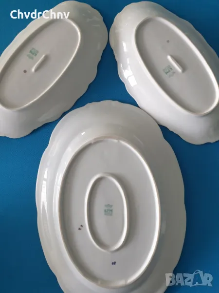 22К злато по ръбовете, отдолу имат маркировки на KPM и надпис че са направени в Полша (в полската фабрика на KPM използвана в десетилетието след втората световна война) между 1945-1952 година.