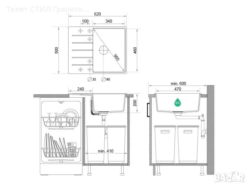 Зелената линия показва необходимото пространство в мм за монтаж на мивката в шкафа !!!