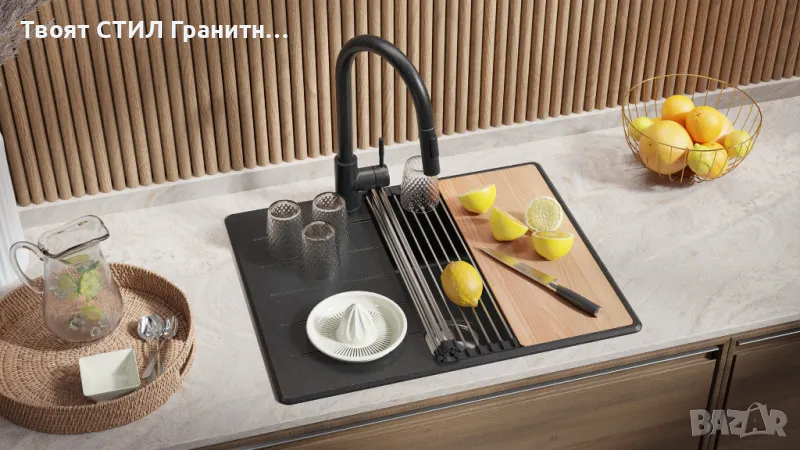 Тази гранитна кухненска мивка е оборудвана с практичен вграден отцедник, който: