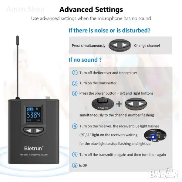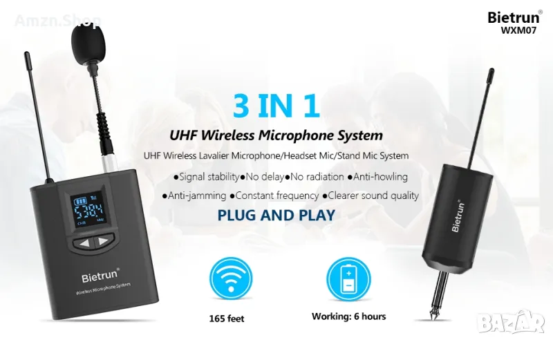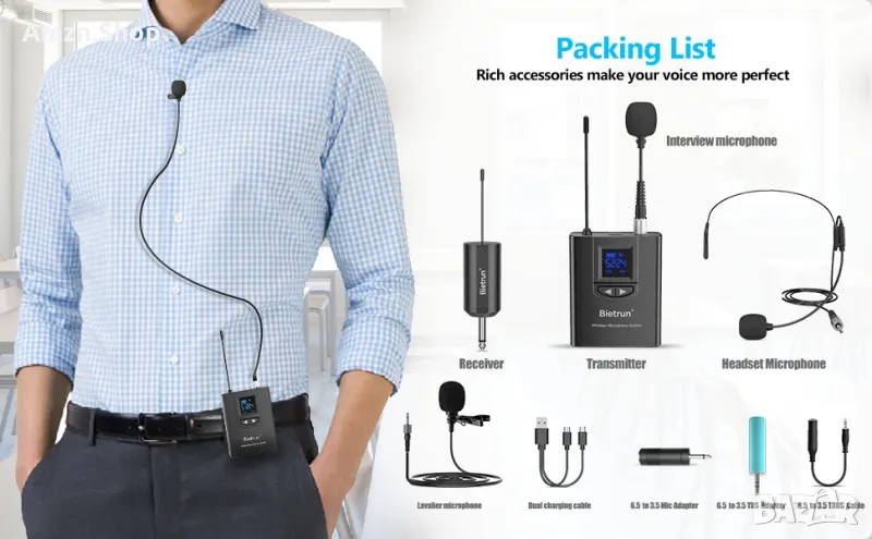 Тази микрофонна система е оборудвана с 3 микрофона! a.Микрофон за слушалки b.Ръчен микрофон c.Микрофон Lavalier Lapel. Спестете време, няма нужда да харчите допълнителни пари за закупуване на други аксесоари. Кажете сбогом на досадните избори.
